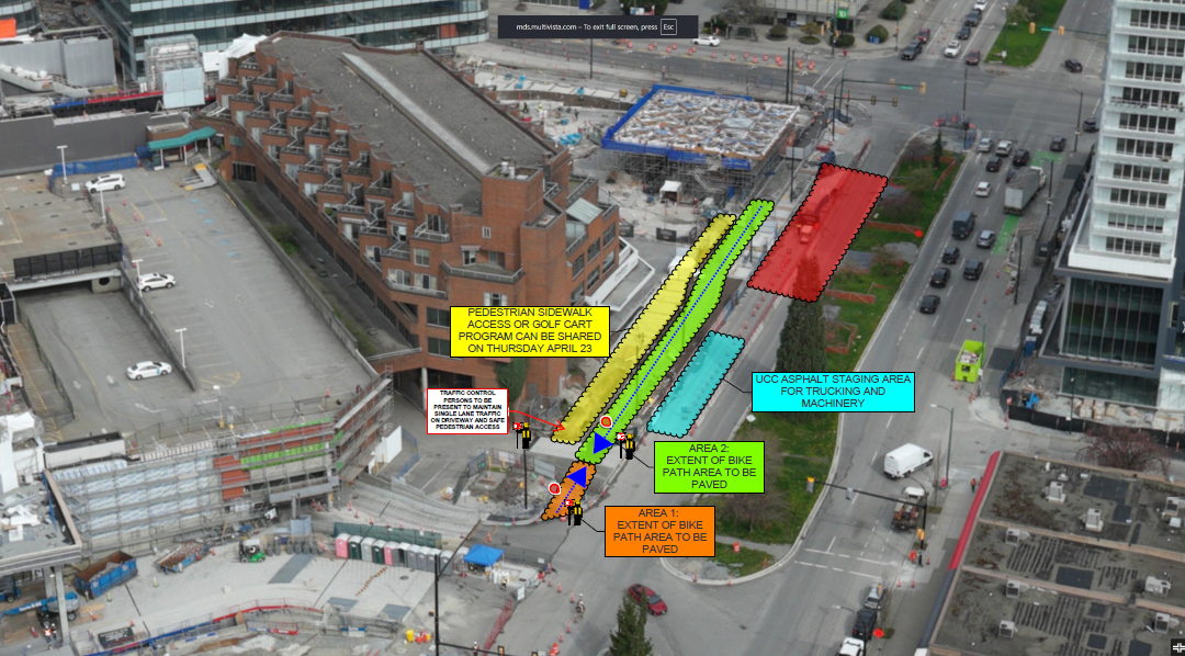 1) Paving and road work will be undertaken along Cambie St for the period April 20 to May 4. Disruptions and changes to traffic flow southbound to be expected. Golf cart service will be available and will share the sidewalk with pedestrians. Traffic control personnel will be present to ensure access and safe travel.